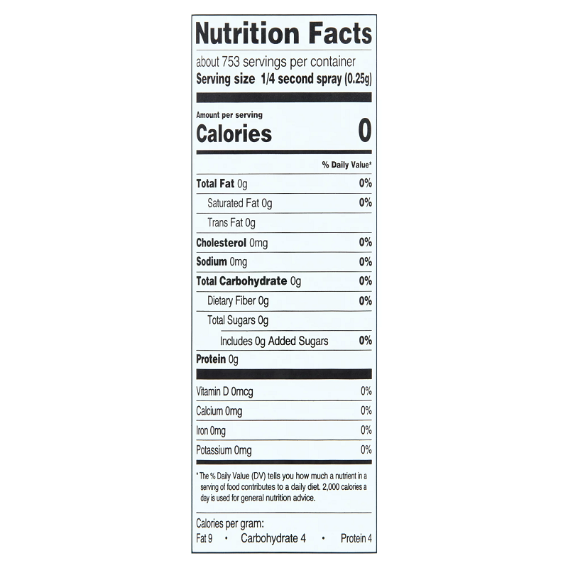Dầu đậu nành*, Lecithin đậu nành, Dimethyl Silicone (Để chống tạo bọt). CHỨA: ĐẬU NÀNH. Cũng chứa chất đẩy để phân phối bình xịt. * Thêm một lượng nhỏ chất béo.