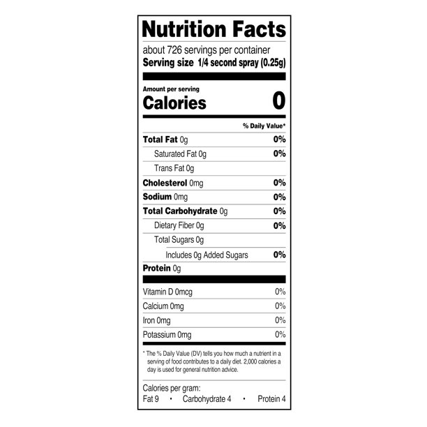 Không có chất béo chuyển hóa và calo trên mỗi khẩu phần ăn, bình xịt này là một giải pháp trong nhà bếp với các món ăn trứng, bánh kếp, bánh quế và bánh mì kẹp pho mát nướng, cũng như thịt, cá và rau.