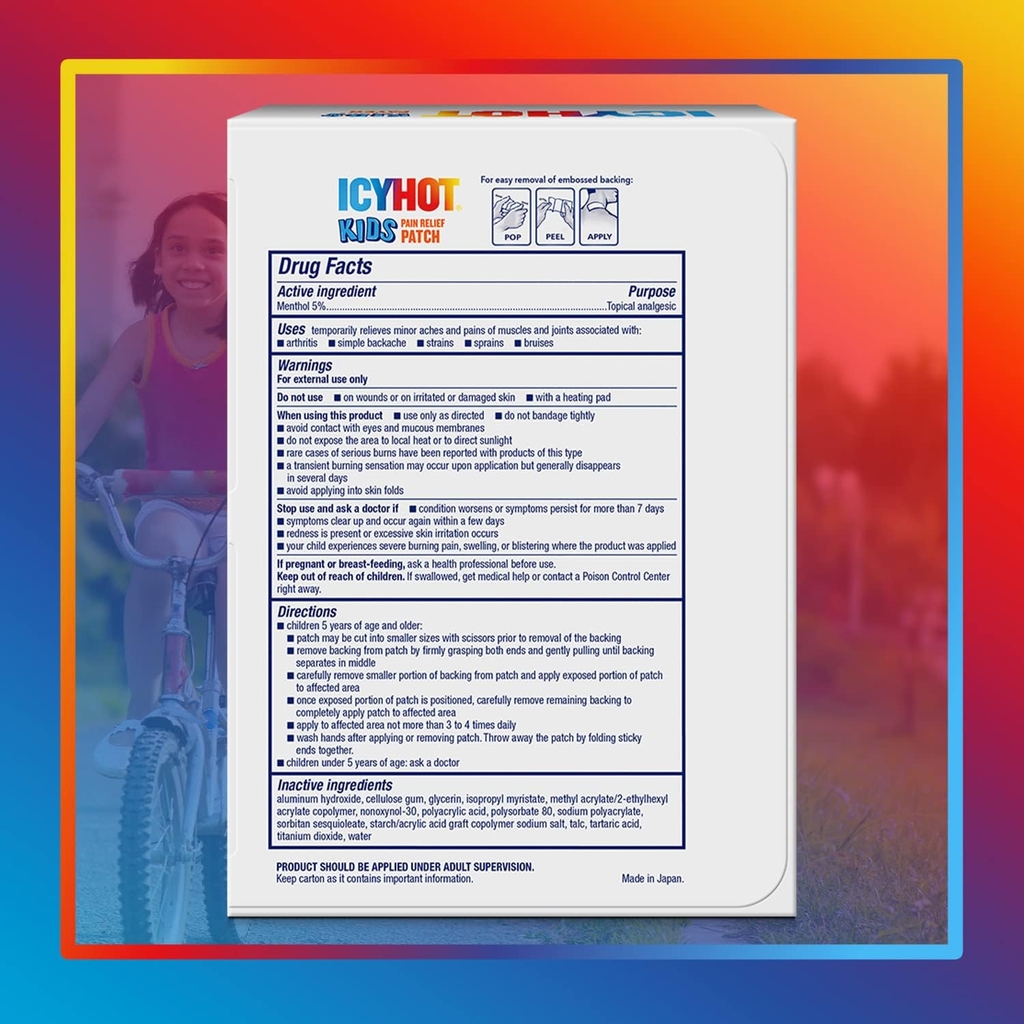 Những miếng dán cỡ trẻ em này có thể vừa với lưng, chân, cánh tay và vai của con bạn Miếng dán giảm đau làm mát được làm bằng tinh dầu bạc hà có nguồn gốc tự nhiên Không chứa cồn, chất bảo quản, hương thơm, silicone, thuốc nhuộm, paraben và phthalates